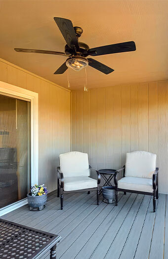 Weather-resistant ceiling fan installation for patios, decks and verandas. Built to withstand humidity and outdoor conditions while providing cooling comfort.